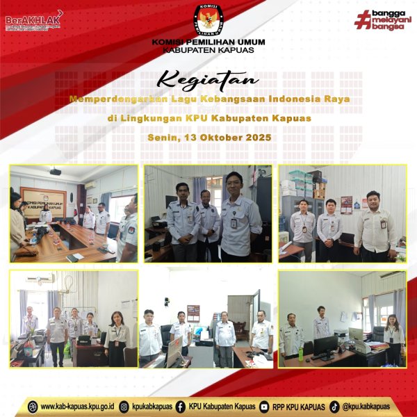 Kuala Kapuas - https://kab-kapuas.kpu.go.id/-, Komisi Pemilihan Umum Kabupaten Kapuas Giat Memperdengarkan Lagu kebangsaan Indonesia Raya di Lingkungan Kantor KPU Kabupaten Kapuas pada hari Senin, 13 Oktober 2025. Sesuai dengan Surat Dinas Sekretaris Jenderal Komisi Pemilihan Umum Republik Indonesia Nomor : 350/PK.02-SD/03/2025 tanggal 31 Januari 2025 Perihal Pemberitahuan untuk Memperdengarkan Lagu Kebangsaan Indonesia Raya dan Naskah Lainnya Pukul 10.00 Wib waktu setempat. ....
