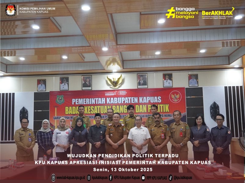 Kuala Kapuas - https://kab-kapuas.kpu.go.id/-, Komisi Pemilihan Umum (KPU) Kabupaten Kapuas menghadiri undangan rapat pembentukan Kelompok Kerja (Pokja) Pendidikan Politik Terpadu yang diselenggarakan oleh Pemerintah Daerah Kabupaten Kapuas yang dilaksanakan melalui Badan Kesatuan Bangsa dan Politik (Kesbangpol) Kabupaten Kapuas, bertempat di Aula Kantor Kesbangpol Kabupaten Kapuas, Senin, 13 Oktober 2025. Kegiatan ini diinisiasi oleh Kesbangpol sebagai mewujudkan kepedulian Pemerintah Daerah Kabupaten Kapuas serta dalam rangka sinergitas Pemkab Kapuas dengan Penyelenggara Pemilu dalam mendukung pelaksanaan pendidikan politik yang terpadu, partisipatif, dan berkelanjutan di Kabupaten Kapuas. Kegiatan yang bertempat di Aula Kesbangpol Kapuas ini dimulai pukul 10.00 WIB dihadiri oleh berbagai unsur lembaga, organisasi / instansi vertikal dan organisasi perangkat daerah, antara lain Pemerintah Daerah Kabupaten Kapuas, KPU Kabupaten Kapuas, Bawaslu Kabupaten Kapuas, Badan Kesbangpol Kabupaten Kapuas, serta Dinas Komunikasi, Informatika, Statistik, dan Persandian (Diskominfosantik) Kabupaten Kapuas. Adapun Sekretaris Daerah Kabupaten Kapuas, Usis I Sangkai pada saat pembukaan acara rapat ini menyampaikan "Rapat Pokja ini sebagai wujud nyata bahwa Pemerintah Daerah Peduli pada Demokrasi, juga sebagai upaya dalam Peningkatan Partisipasi Penggunaan Hal Pilih Masyarakat Kabupaten Kapuas pada Pemilu dan Pilkada di Kabupaten Kapuas". Dalam kesempatan yang sama, Ketua KPU Kabupaten Kapuas, Charles menyampaikan "yang pertama-pertama kami mengapresiasi Pemerintah Daerah Kabupaten Kapuas atas kegiatan Perdana Rapat Pokja ini, mengingat pentingnya kolaborasi lintas sektor dalam membangun kesadaran politik masyarakat, terutama sebagai persiapan sejak diri menjelang tahapan-tahapan Pemilu 2029 yang akan datang, dimana melalui Pokja Pendidikan Politik Terpadu ini, diharapkan kegiatan pendidikan politik terpadu di daerah dapat berjalan lebih terarah, terukur, dan menyentuh seluruh lapisan masyarakat. Adapun Anggota KPU Kabupaten Kapuas, Dina Mariana turut menambahkan "forum kolaboratif ini sebagai bentuk komitmen bersama untuk memperkuatq demokrasi dan menumbuhkan partisipasi aktif masyarakat dalam setiap proses politik dan kepemiluan. (Media Center KPU Kapuas/GC) ....