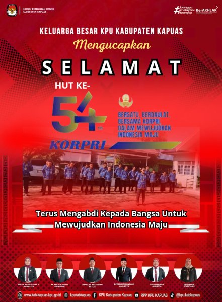 KPU Kabupaten Kapuas mengucapkan Selamat Hari Korps Pegawai Republik Indonesia (KORPRI) ke-54. Di momentum peringatan kali ini, mari meneguhkan kembali komitmen meningkatkan Profesionalitas, Integritas, dan Kualitas Pelayanan kepada Masyarakat, serta selalu menanamkan dalam hati sanubari bahwa bahwa setiap langkah bakti dan pengabdian adalah wujud kontribusi nyata bagi terwujudnya tata kelola Reformasi Birokrasi Pemerintahan yang bersih, efektif dan berkeadilan. Bersatu, Berdaulat, bersama KORPRI, dalam mewujudkan Indonesia Maju. ....
