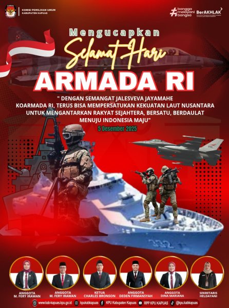 Kuala Kapuas - https://kab-kapuas.kpu.go.id/-, Komisi Pemilihan Umum Kabupaten Kapuas Mengucapkan Selamat Hari Armada RI 5 Desember 2025. " Dengan Semangat Jalesveva Jayamahe Koarmada RI, terus bisa mempersatukan Kekuatan Laut Nusantara untuk mengantarkan Rakyat sejahtera, Bersatu, Berdaulat menujun Indonesia Maju " ....