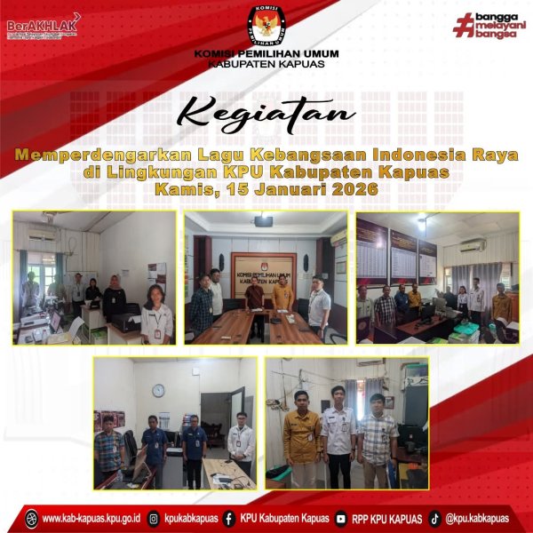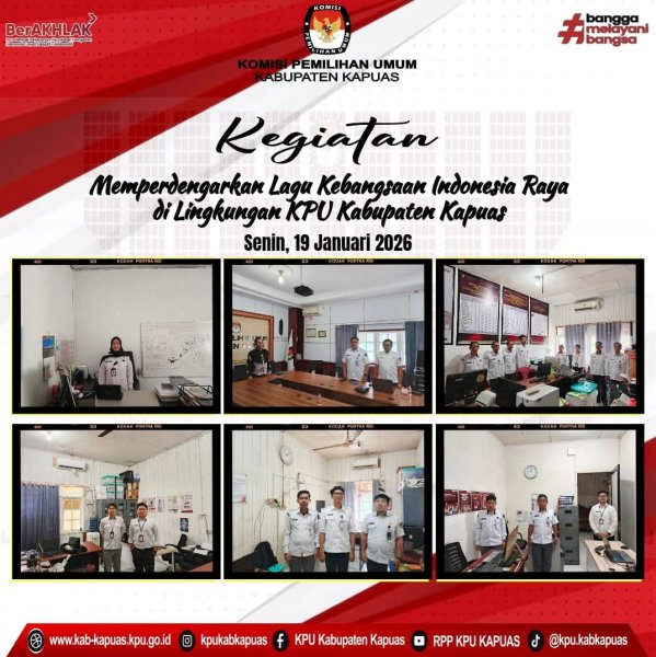 Kuala Kapuas - https://kab-kapuas.kpu.go.id/-, Komisi Pemilihan Umum Kabupaten Kapuas Giat Memperdengarkan Lagu kebangsaan Indonesia Raya di Lingkungan Kantor KPU Kabupaten Kapuas pada hari Senin, 19 Januari 2026. Sesuai dengan Surat Dinas Sekretaris Jenderal Komisi Pemilihan Umum Republik Indonesia Nomor : 350/PK.02-SD/03/2025 tanggal 31 Januari 2025 Perihal Pemberitahuan untuk Memperdengarkan Lagu Kebangsaan Indonesia Raya dan Naskah Lainnya Pukul 10.00 Wib waktu setempat. ....