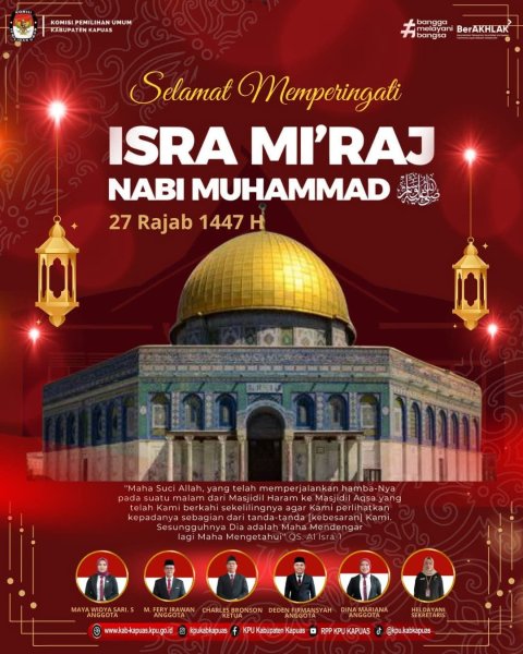 Kuala Kapuas - https://kab-kapuas.kpu.go.id/-, Segenap Jajaran KPU Kabupaten Kapuas mengucapkan Selamat Memperingati Isra Mi’raj Nabi Muhammad SAW 1447 H. Semoga peristiwa agung Isra Mi’raj menjadi sumber inspirasi untuk memperkuat keimanan, integritas, dan tanggung jawab dalam menjalankan tugas pengabdian kepada bangsa dan negara. ....
