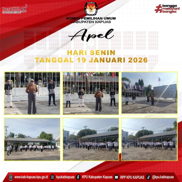 Kuala Kapuas - https://kab-kapuas.kpu.go.id/-, KPU Kabupaten Kapuas Melaksanakan Apel Pagi Senin, (19/1/2026) di Halaman Kantor KPU Kabupaten Kapuas, sebagai Pembina Apel Pagi adalah Anggota KPU Kabupaten Kapuas Divisi Sosdiklih Parmas dan SDM Dina Mariana, didampingi Ketua KPU Kabupaten Kapuas Charles Bronson, Anggota KPU Kabupaten Kapuas Divisi Perencanaan Data dan Informasi M. Fery Irawan, Sekretaris KPU Kabupaten Kapuas Heldayani, Pemimpin Apel pagi Wahyudi Romansyah (Plt. Kasubbag Teknis dan Hukum ), peserta Apel Pagi Kasubbag Parhubmas dan SDM, Kasubbag KUL, Staf PNS, CPNS, PPPK, maupun Pegawai Non ASN, dan Jagat Saksana (JS). ....
