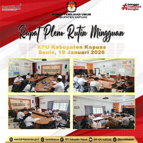 Kuala Kapuas - https://kab-kapuas.kpu.go.id/-, Pelaksanaan Rapat Pleno Rutin Mingguan KPU Kabupaten Kapuas dilaksanakan di Ruang RPP KPU Kabupaten Kapuas. Rapat di pimpin oleh Ketua KPU Kabupaten Kapuas Charles Bronson, hadir Anggota KPU Kabupaten Kapuas Divisi Hukum dan Pengawasan Deden Firmansyah, Divisi Sosdiklih Parmas dan SDM Dina Mariana, Divisi Perencanaan Data dan Informasi M.Fery Irawan, Sekretaris KPU Kabupaten Kapuas Heldayani, Kasubbag Sosdiklih Parmas dan SDM Gagah Christiantoro, Kasubbag KUL Tanti Lupitae, Kasubbag Perencanaan Data dan Informasi Dukan Choiri, Plt. Kasubbag Teknis dan Hukum Wahyudi Romansyah (19/1/2026). ....