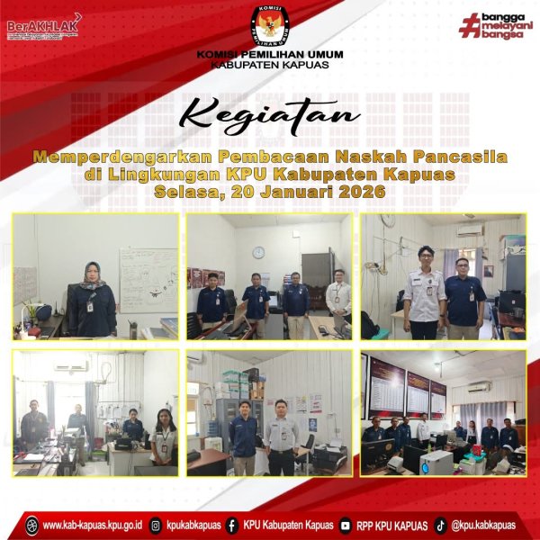 Komisi Pemilihan Umum Kabupaten Kapuas melaksanakan kegiatan Memperdengarkan Pembacaan Naskah Pancasila di Lingkungan Kantor Sekretariat Komisi Pemilihan Umum Kabupaten Kapuas pada hari Selasa, 20 Januari 2026. di Lingkungan KPU Kabupaten Kapuas. Sesuai dengan Surat Dinas Sekretaris Jenderal Komisi Pemilihan Umum Republik Indonesia Nomor : 350/PK.02-SD/03/2025 tanggal 31 Januari 2025 Perihal Pemberitahuan untuk Memperdengarkan Lagu Kebangsaan Indonesia Raya dan Naskah Lainnya pukul 10.00 Wib waktu setempat. ....