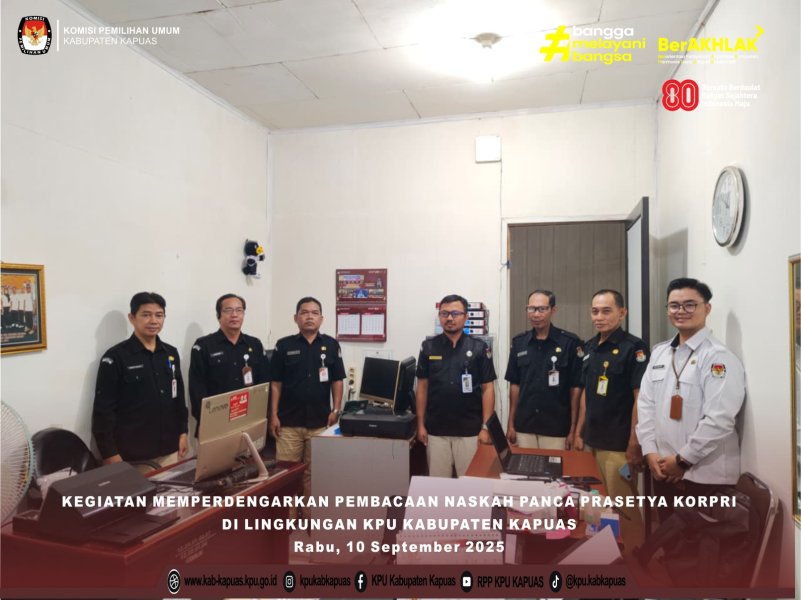 Kuala Kapuas - https://kab-kapuas.kpu.go.id/- Komisi Pemilihan Umum Kabupaten Kapuas giat Memperdengarkan Pembacaan Naskah Panca Prasetya KORPRI di Lingkungan Kantor Sekretariat Komisi Pemilihan Umum Kabupaten Kapuas pada hari Rabu, 10 September 2025. di Lingkungan KPU Kabupaten Kapuas.