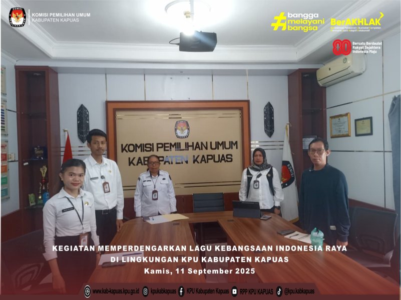 Kuala Kapuas - https://kab-kapuas.kpu.go.id/-, Komisi Pemilihan Umum Kabupaten Kapuas Giat Memperdengarkan Lagu kebangsaan Indonesia Raya di Lingkungan Kantor KPU Kabupaten Kapuas pada hari Kamis, 11 September 2025.