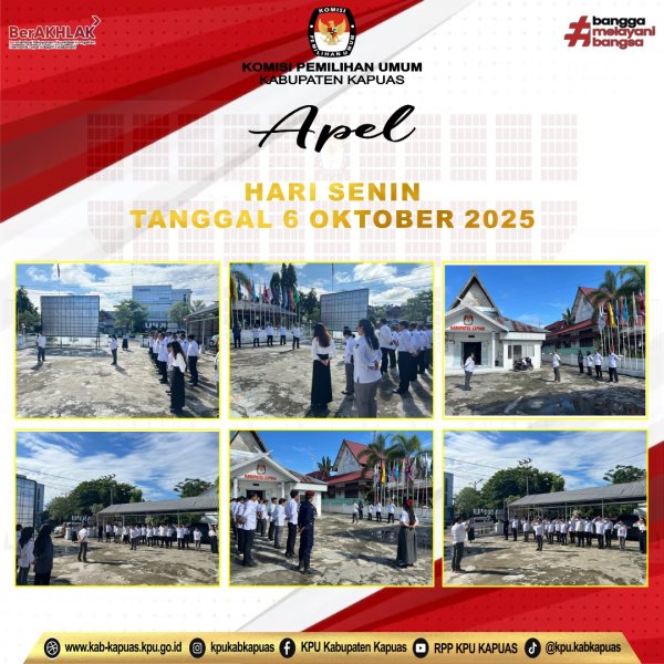 sebagai Pembina Apel Pagi adalah Ketua KPU Kabupaten Kapuas Charles Bronson, di dampingi Anggota KPU Kabupaten Kapuas Divisi Hukum dan Pengawasan Deden Firmansyah, Anggota KPU Divisi Perencanaan Data dan Informasi M, Fery Irawan, Divisi Sosdiklih Parmas dan SDM Dina Mariana, Sekretaris KPU Kabupaten Kapuas Heldayani, Pemimpin Apel pagi Tanti Lupitae ( Kasubbag KUL ), peserta Apel Pagi Kasubbag, Staf PNS, CPNS, maupun Pegawai Non ASN, dan Jagat Saksana (JS).