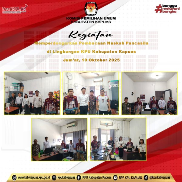 Kuala Kapuas - https://kab-kapuas.kpu.go.id/-, Komisi Pemilihan Umum Kabupaten Kapuas melaksanakan kegiatan Memperdengarkan Pembacaan Naskah Pancasila di Lingkungan Kantor Sekretariat Komisi Pemilihan Umum Kabupaten Kapuas pada hari Jum'at, 10 Oktober 2025. di Lingkungan KPU Kabupaten Kapuas.