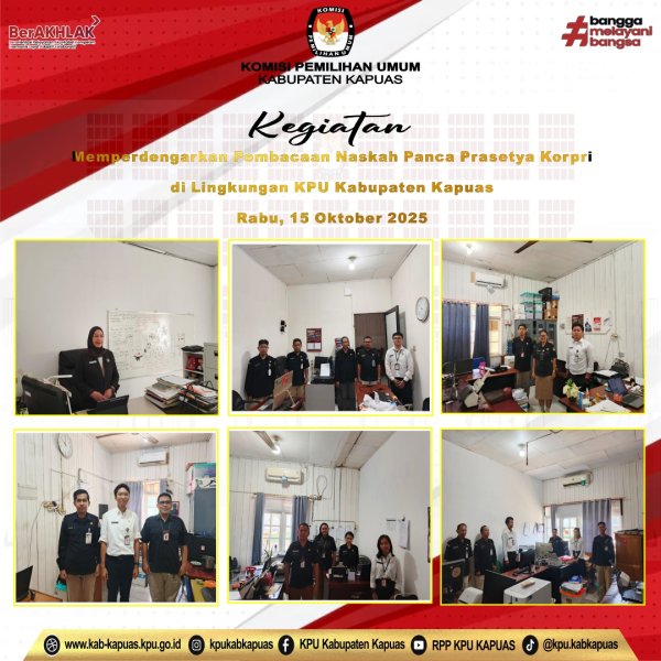 Kuala Kapuas - https://kab-kapuas.kpu.go.id/-, Komisi Pemilihan Umum Kabupaten Kapuas giat Memperdengarkan Pembacaan Naskah Panca Prasetya KORPRI di Lingkungan Kantor Sekretariat Komisi Pemilihan Umum Kabupaten Kapuas pada hari Rabu, 15 Oktober 2025. di Lingkungan KPU Kabupaten Kapuas.