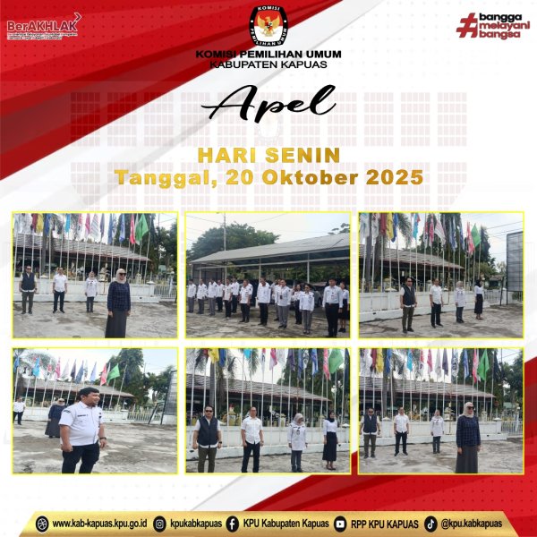 sebagai Pembina Apel Pagi adalah Anggota KPU Kabupaten Kapuas Divisi Sosdiklih Parmas dan SDM Dina Mariana, di dampingi Ketua KPU Kabupaten Kapuas Charles Bronson, Anggota KPU Divisi Hukum dan Pengawasan Deden Firmansyah, Anggota KPU Divisi Teknis Penyelenggara Maya Widya Sari Sihombing, Sekretaris KPU Kabupaten Kapuas Heldayani, Pemimpin Apel pagi Dukan Choiri ( . Kasubbag Perencanaan Data dan Informasi ), peserta Apel Pagi Kasubbag KUL, Kasubbag Parhubmas dan SDM, Plt. Kasubbag Teknis dan Hukum, Staf PNS, CPNS, maupun Pegawai Non ASN, dan Jagat Saksana (JS).