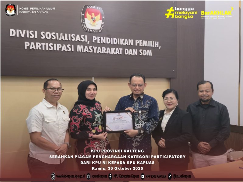 Kuala Kapuas - https://kab-kapuas.kpu.go.id/-, KPU Kabupaten Kapuas resmi menerima fisik Piagam Penghargaan Kategorisasi Participatory yang dianugerahkan oleh KPU Republik Indonesia atas penilaian atau capaian IPP (Indeks Partisipasi Pemilihan) untuk Tingkat Pemilihan Bupati dan Wakil Bupati pada Pilkada 2024.