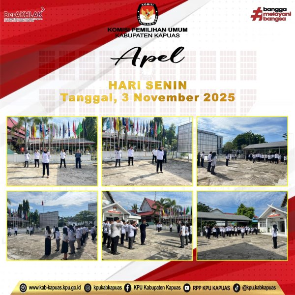 sebagai Pembina Apel Pagi adalah Anggota KPU Kabupaten Kapuas Divisi Teknis Penyelenggara Maya Widya Sari Sihombing, di dampingi Ketua KPU Kabupaten Kapuas Charles Bronson, Anggorta KPU Divisi Sosdiklih Parmas dan SDM Dina Mariana,, Anggota KPU Divisi Hukum dan Pengawasan Deden Firmansyah, Sekretaris KPU Kabupaten Kapuas Heldayani, Pemimpin Apel pagi Tanti Lupitae (Kasubbag KUL ), peserta Apel Pagi Kasubbag Parhubmas dan SDM, Kasubbag Perencanaan Data dan Informasi, Plt. Kasubbag Teknis dan Hukum, Staf PNS, CPNS, maupun Pegawai Non ASN, dan Jagat Saksana (JS).