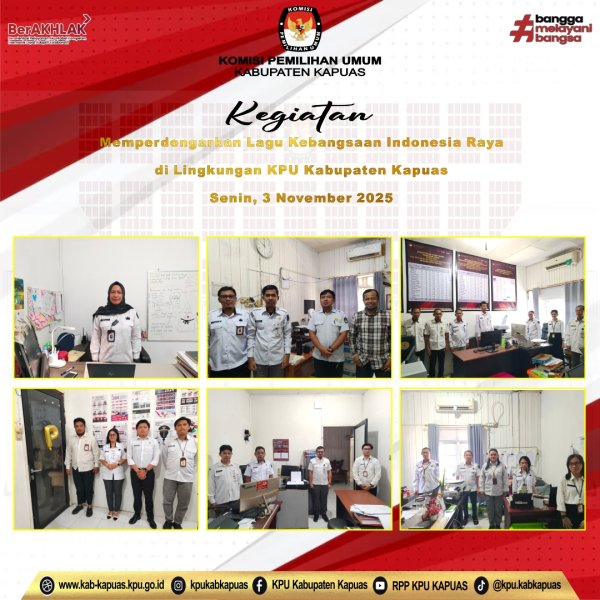 Kuala Kapuas - https://kab-kapuas.kpu.go.id/-, Komisi Pemilihan Umum Kabupaten Kapuas Giat Memperdengarkan Lagu kebangsaan Indonesia Raya di Lingkungan Kantor KPU Kabupaten Kapuas pada hari Senin, 3 November 2025.