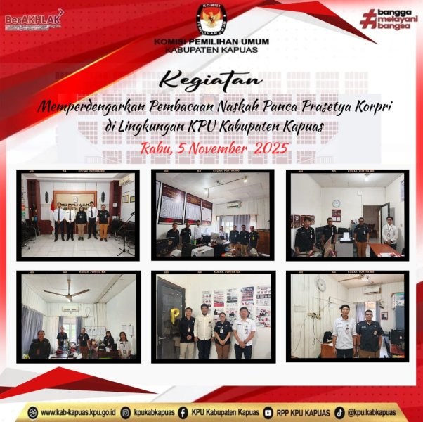 Kuala Kapuas - https://kab-kapuas.kpu.go.id/-, Komisi Pemilihan Umum Kabupaten Kapuas giat Memperdengarkan Pembacaan Naskah Panca Prasetya KORPRI di Lingkungan Kantor Sekretariat Komisi Pemilihan Umum Kabupaten Kapuas pada hari Rabu, 5 November 2025. di Lingkungan KPU Kabupaten Kapuas.