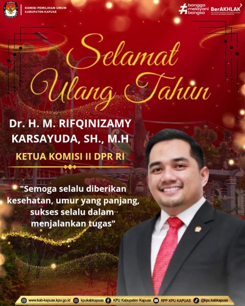 Kuala Kapuas - https://kab-kapuas.kpu.go.id/-, KPU Kabupaten Kapuas mengucapkan Selamat Ulang Tahun kepada Ketua Komisi II DPR RI Bapak Dr. H. M. Rifqinizamy Karsayuda, SH., M.H