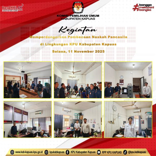 Kuala Kapuas - https://kab-kapuas.kpu.go.id/-, Komisi Pemilihan Umum Kabupaten Kapuas melaksanakan kegiatan Memperdengarkan Pembacaan Naskah Pancasila di Lingkungan Kantor Sekretariat Komisi Pemilihan Umum Kabupaten Kapuas pada hari Selasa, 11 November 2025. di Lingkungan KPU Kabupaten Kapuas.