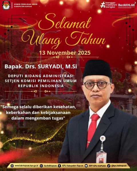 Segenap Jajaran KPU Kabupaten Kapuas mengucapkan Selamat Ulang Tahun Bapak Drs. Suryadi, M.SI Deputi Bidang Administrasi Setjen Komisi Pemilihan Umum Republik Indonesia.