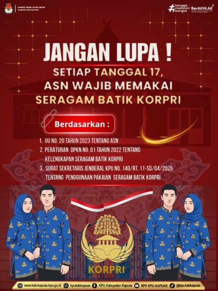 Kuala Kapuas - https://kab-kapuas.kpu.go.id/-, ingat ya berdasarkan pada aturan yang berlaku, bahwa setiap tanggal 17 ASN wajib memakai seragam Batik Korpri !