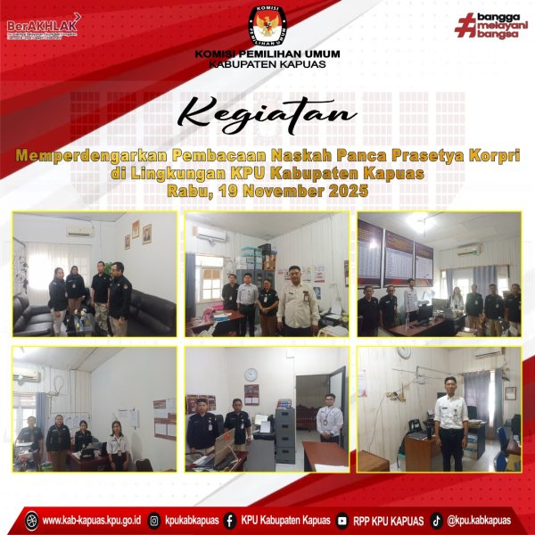 Kuala Kapuas - https://kab-kapuas.kpu.go.id/-, Komisi Pemilihan Umum Kabupaten Kapuas giat Memperdengarkan Pembacaan Naskah Panca Prasetya KORPRI di Lingkungan Kantor Sekretariat Komisi Pemilihan Umum Kabupaten Kapuas pada hari Rabu, 19 November 2025. di Lingkungan KPU Kabupaten Kapuas.