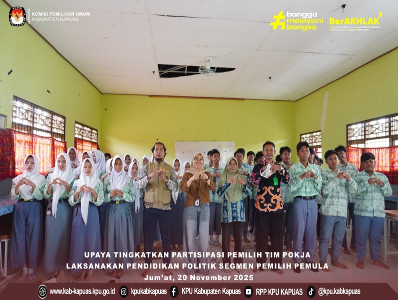 Kuala Kapuas - https://kab-kapuas.kpu.go.id/-, Tim Pokja Pendidikan Politik Terpadu yang terdiri dari Badan Kesatuan Bangsa dan Politik (Kesbangpol) Kabupaten Kapuas, KPU Kabupaten Kapuas, Bawaslu Kabupaten Kapuas serta Diskominfosantik Kabupaten Kapuas melaksanakan Sosialisasi Pendidikan Politik bagi Pemilih Pemula dengan tema “Politik Cerdas, Harmoni Terjaga, Kapuas Bersinar" dan Sub Tema "Cerdas Memilih, Santun Berpendapat, Anti Hoaks, Anti Politik Uang, berlandaskan Pancasila dan Falsafah Huma Betang" pada 4 Kecamatan yaitu Kecamatan Basarang, Kecamatan Kapuas Hilir, Kecamatan Pulau Petak dan Kecamatan Tamban Catur”. (20/11/2025)