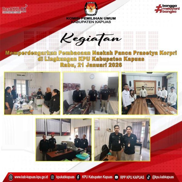 Kuala Kapuas - https://kab-kapuas.kpu.go.id/-, Komisi Pemilihan Umum Kabupaten Kapuas giat Memperdengarkan Pembacaan Naskah Panca Prasetya KORPRI di Lingkungan Kantor Sekretariat Komisi Pemilihan Umum Kabupaten Kapuas pada hari Rabu, 21 Januari 2026. di Lingkungan KPU Kabupaten Kapuas.