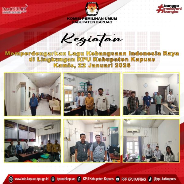 Kuala Kapuas - https://kab-kapuas.kpu.go.id/-, Komisi Pemilihan Umum Kabupaten Kapuas Giat Memperdengarkan Lagu kebangsaan Indonesia Raya di Lingkungan Kantor KPU Kabupaten Kapuas pada hari Kamis, 22 Januari 2026.