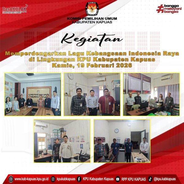 Kuala Kapuas - https://kab-kapuas.kpu.go.id/- Komisi Pemilihan Umum Kabupaten Kapuas Giat Memperdengarkan Lagu kebangsaan Indonesia Raya di Lingkungan Kantor KPU Kabupaten Kapuas pada hari Kamis, 19 Februari 2026.