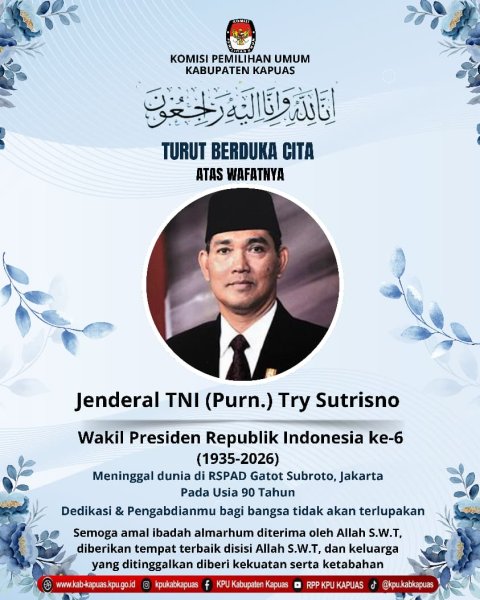 Kuala Kapuas - https://kab-kapuas.kpu.go.id/-, Innalillahi wa inna ilaihi raji’un. Segenap Jajaran KPU Kabupaten Kapuas turut berduka cita yang sedalam-dalamnya atas wafatnya Bapak Try Sutrisno, Wakil Presiden Republik Indonesia Ke-6 (Periode 1993–1998).