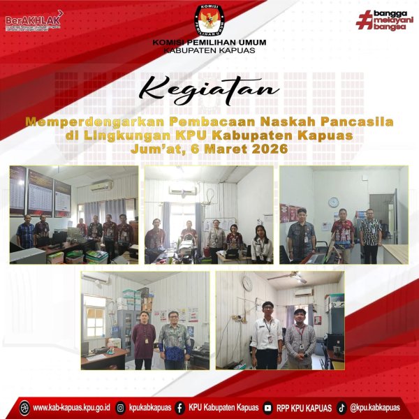 Kuala Kapuas - https://kab-kapuas.kpu.go.id/-, Komisi Pemilihan Umum Kabupaten Kapuas melaksanakan kegiatan Memperdengarkan Pembacaan Naskah Pancasila di Lingkungan Kantor Sekretariat Komisi Pemilihan Umum Kabupaten Kapuas pada hari Jum'at, 6 Maret 2026. di Lingkungan KPU Kabupaten Kapuas.