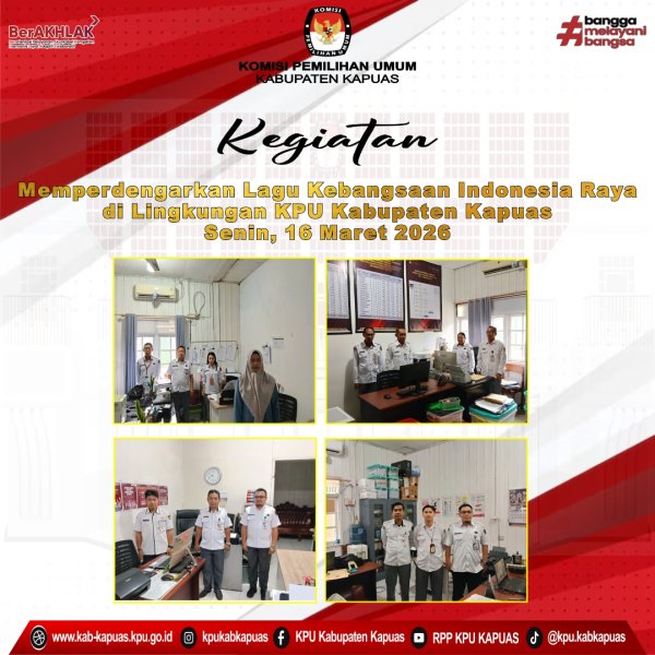 Kuala Kapuas - https://kab-kapuas.kpu.go.id/- Komisi Pemilihan Umum Kabupaten Kapuas Giat Memperdengarkan Lagu kebangsaan Indonesia Raya di Lingkungan Kantor KPU Kabupaten Kapuas pada hari Senin, 16 Maret 2026.