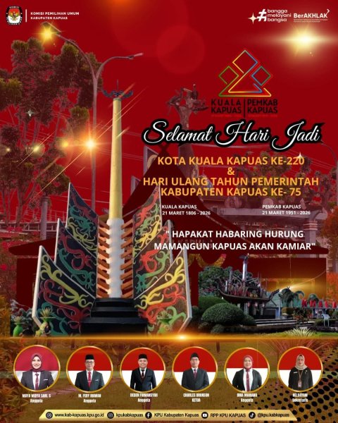 Segenap jajaran KPU Kabupaten Kapuas mengucapkan Selamat Hari Jadi Kota Kuala Kapuas ke-220 & Hari Ulang Tahun Pemerintah Kabupaten Kapuas ke-75