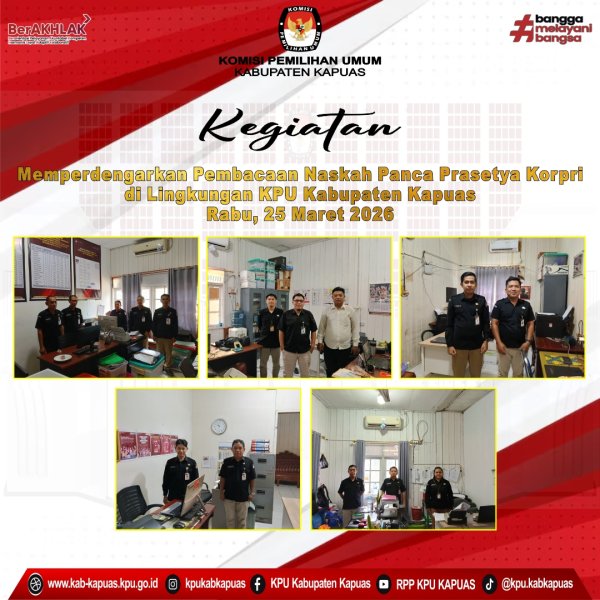 Kuala Kapuas - https://kab-kapuas.kpu.go.id/- Komisi Pemilihan Umum Kabupaten Kapuas giat Memperdengarkan Pembacaan Naskah Panca Prasetya KORPRI di Lingkungan Kantor Sekretariat Komisi Pemilihan Umum Kabupaten Kapuas pada hari Rabu, 25 Maret 2026. di Lingkungan KPU Kabupaten Kapuas.