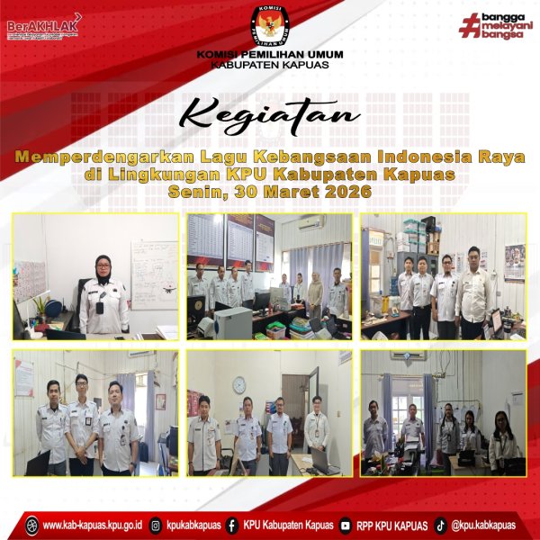 Kuala Kapuas - https://kab-kapuas.kpu.go.id/- Komisi Pemilihan Umum Kabupaten Kapuas Giat Memperdengarkan Lagu kebangsaan Indonesia Raya di Lingkungan Kantor KPU Kabupaten Kapuas pada hari Senin, 30 Maret 2026.