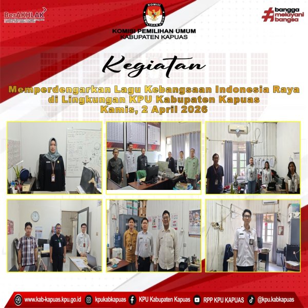 Kuala Kapuas - https://kab-kapuas.kpu.go.id/- Komisi Pemilihan Umum Kabupaten Kapuas Giat Memperdengarkan Lagu kebangsaan Indonesia Raya di Lingkungan Kantor KPU Kabupaten Kapuas pada hari Kamis, 2 April 2026.