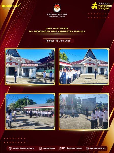 KPU Kabupaten Kapuas Melaksanakan Apel Pagi Senin, (16/6/2025) di Halaman Kantor KPU Kabupaten Kapuas, sebagai Pembina Apel Pagi adalah Ketua KPU Kabupaten Kapuas Deden Firmansyah, di dampingi Sekretaris KPU Kabupaten Kapuas Heldayani, Pemimpin Apel pagi Bahrudin (Jagat