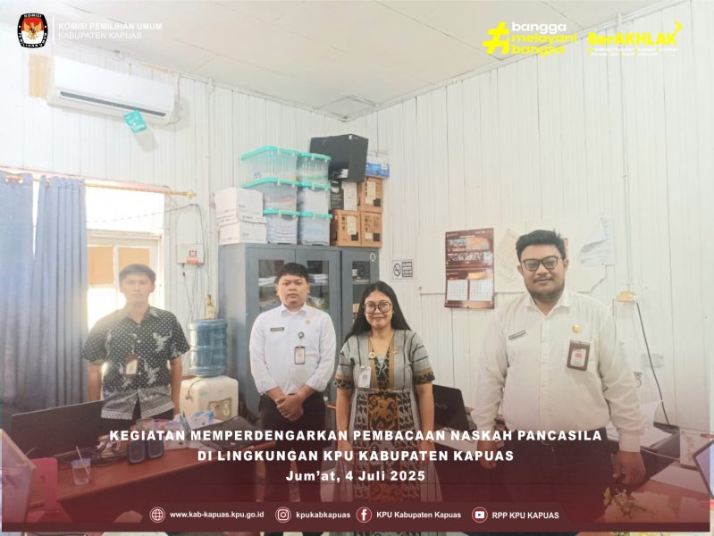 Komisi Pemilihan Umum Kabupaten Kapuas melaksanakan kegiatan Memperdengarkan Pembacaan Naskah Pancasila di Lingkungan Kantor Sekretariat Komisi Pemilihan Umum Kabupaten Kapuas pada hari Jum'at, 4 Juli 2025. di Lingkungan KPU Kabupaten Kapuas.