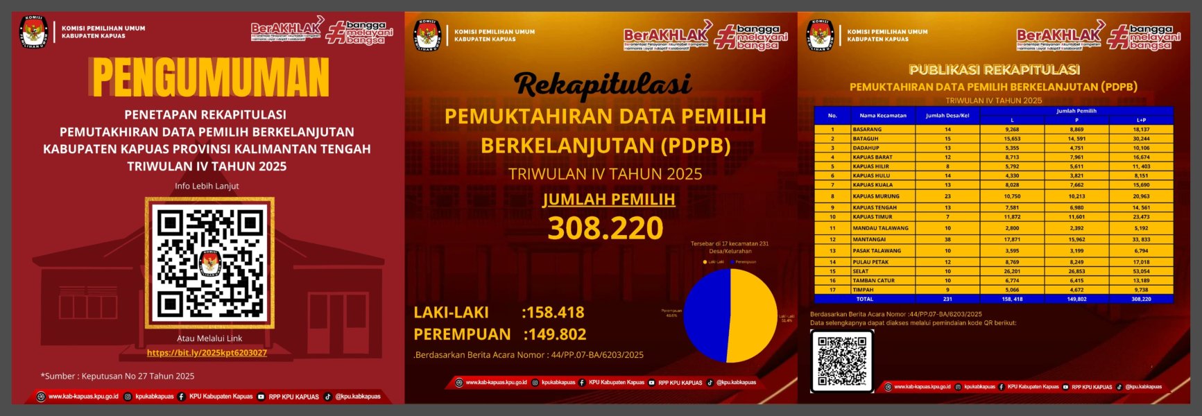 Adapun dikesempatan yang sama Anggota KPU Kabupaten Kapuas M. Fery Irawan mengungkapkan "bahwa Rekapitulasi ini merupakan bagian dari pelaksanaan ketentuan Peraturan KPU Nomor 1 Tahun 2025, dimana hasil rekapitulasi dituangkan dalam formulir Model A-Rekap Kabupaten/Kota-PDPK sebagai bahan pemutakhiran daftar pemilih secara keberlanjutan. Berdasarkan hasil rekap, jumlah pemilih Triwulan IV Tahun 2025 di Kapuas tercatat sebanyak . 308.220 pemilih, dengan rincian 158.418 pemilih laki-laki dan 149.802 pemilih perempuan. Jumlah tersebut mengalami peningkatan dibandingkan Triwulan III yang tercatat sebanyak 305.520 pemilih, atau bertambah 2.700 pemilih.