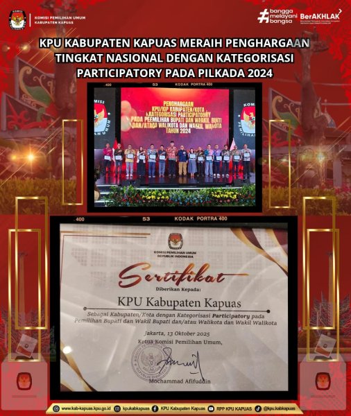Kuala Kapuas - https://kab-kapuas.kpu.go.id/-, Komisi Pemilihan Umum Kabupaten Kapuas menorehkan prestasi membanggakan di tingkat Nasional dimana KPU Republik Indonesia memberikan Penghargaan kepada KPU Kabupaten Kapuas dengan kategorisasi Participatory pada gelaran Pemilihan Kepala Daerah Tahun 2024, (18/10/2025). Penghargaan ini sebagai bentuk komitmen KPU Kabupaten Kapuas dalam upaya meningkatkan Partisipasi Pemilih serta mendorong keterlibatan masyarakat pada setiap tahapan pemilihan kepala daerah yang didokumentasikan dengan baik. Penghargaan ini diberikan oleh Inspektur Utama Sekretariat Pemiliah KPU, Nanang Priyatna pada kegiatan Rakor dan Launching Indeks Partisipasi Pemilu kepada Anggota KPU Provinsi Kalimantan Tengah, Harmain, selaku Ketua Divisi Sosdiklih dan SDM. Ketua KPU Kabupaten Kapuas, Charles Bronson, menyampaikan rasa syukur dan bangga atas penghargaan yang diraih, dimana ini merupakan capaian dan hasil kerja kolektif jajaran KPU Kabupaten Kapuas yang juga dibantu oleh Badan Adhoc PPK, PPS serta KPPS pada Pemilihan Kepala Daerah pada Tahun 2024 kemarin, juga andil dari Pemerintah Daerah dan stakeholder di Kabupaten Kapuas yang mendukung jalan nya tahapan dengan baik, lancar dan kondusif. sehingga penghargaan ini menjadi motivasi satker untuk memberikan kerja terbaik untuk menghadirkan Pemilu / Pilkada yang akan datang yang inklusif, jujur, transparan serta berintegritas. Pada penilaian akhir KPU Kabupaten Kapuas merupakan satu-satunya perwakilan dari Provinsi Kalimantan Tengah yang mendapatkan Penghargaan Participatory (Komitmen Penuh) dengan hasil pengukuran Indeks Partisipasi Pilkada (IPP) Tingkat Kabupaten/Kota dengan skor 77,73 dimana termasuk dari 4,7% atau 24 Kabupaten/Kota yang juga meraih penghargaan ini dengan rentang skor > 77,5 .Adapun 446 Kabupaten/Kota atau sebesar 87,8 masuk kategori engagement (aksi) dengan rentang skor 60-77,5 serta 38 Kabupaten/Kota atau sebesar 7,5% masuk kategori involvement (keterlibatan) dengan rentang skor <60. Penghargaan atas Kategori Partisipatif merupakan indikator penting dalam Evaluasi oleh KPU di setiap Tingkatan, dimana terhadap penyelenggaran Pemilu / Pilkada di Daerah mesti terdokumentasi dengan baik serta juga mencakup aspek keterlibatan warga masyarakat sejak tahapan awal hingga akhir penyelenggaraan Pilkada, partisipasi pemilih, pencalonan, kampanye, sosialisasi dan pendidikan pemilih serta voter turnout, dimana diperlukan juga pemahaman bahwa partisipasi adalah hasil dari interaksi berlapis antara kesiapan kelembagaan, kualitas kontestasi, ruang deliberasi politik dan kesadaran pemilih yang disertai pendekatan inkusif kepada kelompok rentan dan pemilih pemula. Dengan diraih penghargaan ini, KPU Kabupaten Kapuas akan semakin berbenah untuk mempertahankan prestasi yang telah dicapai serta menjaga kepercayaan publik dalam setiap proses demokrasi di Kabupaten Kapuas. (G.C/Humas KPU Kapuas)