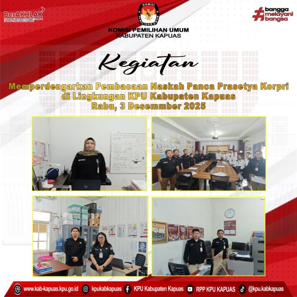 Kuala Kapuas - https://kab-kapuas.kpu.go.id/-, Komisi Pemilihan Umum Kabupaten Kapuas giat Memperdengarkan Pembacaan Naskah Panca Prasetya KORPRI di Lingkungan Kantor Sekretariat Komisi Pemilihan Umum Kabupaten Kapuas pada hari Rabu, 3 Desember 2025. di Lingkungan KPU Kabupaten Kapuas. Sesuai dengan Surat Dinas Sekretaris Jenderal Komisi Pemilihan Umum Republik Indonesia Nomor : 350/PK.02-SD/03/2025 tanggal 31 Januari 2025 Perihal Pemberitahuan untuk Memperdengarkan Lagu Kebangsaan Indonesia Raya dan Naskah Lainnya pukul 10.00 Wib waktu setempat.