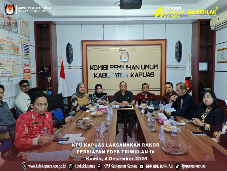 Kuala Kapuas - https://kab-kapuas.kpu.go.id/-, KPU Kabupaten Kapuas pada hari ini melakukan rapat koordinasi sebagai persiapan Pelaksanaan Pleno Rekapitulasi Pemutakhiran Daftar Pemilih Berkelanjutan Triwulan IV tahun 2025 (04/12/2025). Kegiatan ini dilaksanakan di Ruang RPP KPU Kabupaten Kapuas, pada pukul 14.00 WIB yang dibuka oleh Ketua KPU Kabupaten Kapuas Charles Bronson, adapun jalannya kegiatan Rakor ini dipimpin oleh Anggota KPU Kabupaten Kapuas Divisi Perencanaan, Data dan Informasi M. Fery Irawan, dan diikuti juga oleh Anggota KPU yaitu Dina Mariana, Deden Firmansyah dan Maya Widya Sari Sihombing. Adapun dari Bawaslu Kabupaten Kapuas yang hadir mengikuti rapat Koordinasi ini yaitu Ketua Bawaslu Kapuas Iswahyudi Wibowo beserta Anggota, serta dihadiri oleh Stakeholder terkait. Kegiatan Rapat Koordinasi ini dilaksanakan menjelang Pleno Penetapan Rekapitulasi Pemutakhiran Daftar Pemilih Berkelanjutan (PDPB) Triwulan IV yang akan dijadwalkan pelaksanaannya pada hari Senin, tanggal 8 Desember 2025. (G.C/Parhubmas KPU Kapuas)