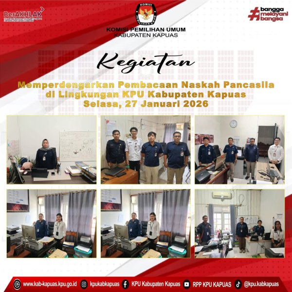 sebagai Pembina Apel Pagi adalah Ketua KPU Kabupaten Kapuas Charles Bronson, didampingi Anggota KPU Kabupaten Kapuas Divisi Perencanaan Data dan Informasi M. Fery Irawan, Sekretaris KPU Kabupaten Kapuas Heldayani, Pemimpin Apel pagi Dukan Choiri ( Kasubbag Perencanaan Data dan Informasi ), peserta Apel Pagi Kasubbag Parhubmas dan SDM, Kasubbag KUL, Plt. Kasubbag Teknis Penyelenggara dan Hukum, Staf PNS, CPNS, PPPK, maupun Pegawai Non ASN, dan Jagat Saksana (JS).