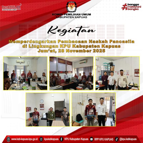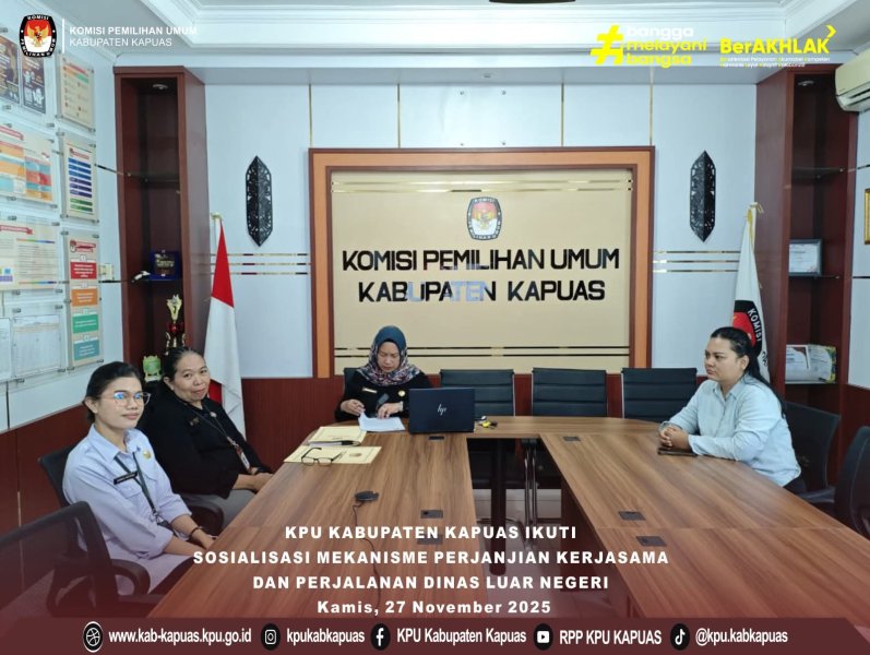Kuala Kapuas - https://kab-kapuas.kpu.go.id/-, Sekretaris KPU Kabupaten Kapuas, Heldayani, beserta Kasubbag Keuangan, Umum dan Logistik, Tanti Lupitae, Kasubbag Perencanaan, Data dan Informasi, Dukan Choiri, dan Kasubbag Parhubmas dan SDM, Gagah Christiantoro, beserta Staf dari Subbagian Teknis dan Hukum, Staf Subbagian Keuangan, Umum dan Logistik, hari Rabu sampai dengan Kamis , 26-27 November 2025 telah mengikuti Sosialisasi Mekanisme Pelaksanaan Kerja Sama Luar Negeri dan Dalam Negeri, serta Kebijakan dan Tata Cara Perjalanan Dinas Luar Negeri. (27/11/2025)