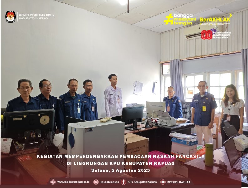 Kuala Kapuas - https://kab-kapuas.kpu.go.id/-, Komisi Pemilihan Umum Kabupaten Kapuas melaksanakan kegiatan Memperdengarkan Pembacaan Naskah Pancasila di Lingkungan Kantor Sekretariat Komisi Pemilihan Umum Kabupaten Kapuas pada hari Selasa, 5 Agustus 2025. di Lingkungan KPU Kabupaten Kapuas.
