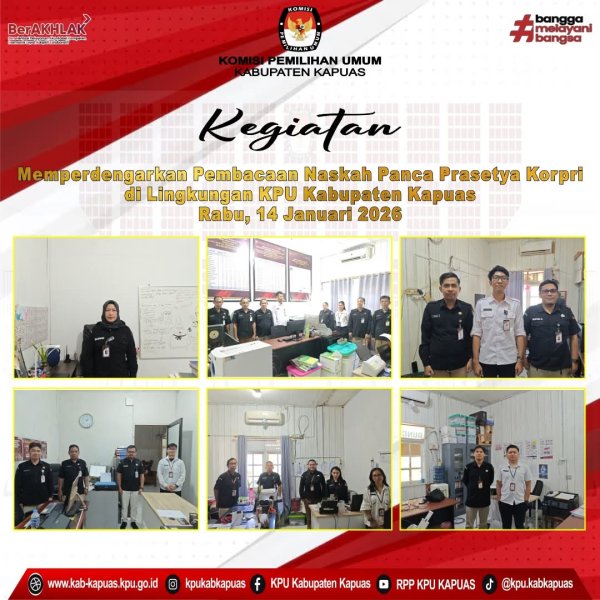 sebagai Pembina Apel Pagi adalah Anggota KPU Kabupaten Kapuas Divisi Perencanaan Data dan Informai M. Fery Irawan, didampingi Ketua KPU Kabupaten Kapuas Charles Bronson, Anggota KPU Kabupaten Kapuas Divisi Hukum dan Pengawasan Deden Firmansyah, Anggota KPU Divisi Sosdiklih Parmas dan SDM Dina Mariana, Sekretaris KPU Kabupaten Kapuas Heldayani, Pemimpin Apel pagi Tanti Lupitae (Kasubbag KUL ), peserta Apel Pagi Kasubbag Parhubmas dan SDM, Plt. Kasubbag Teknis dan Hukum, Staf PNS, CPNS, PPPK, maupun Pegawai Non ASN, dan Jagat Saksana (JS).