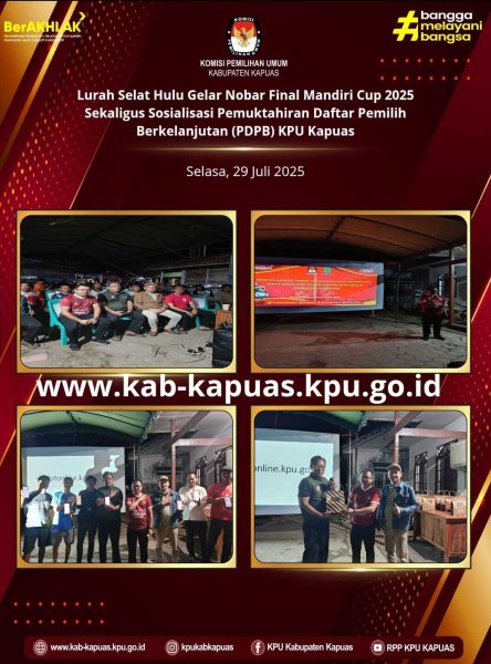 Kuala Kapuas - https://kab-kapuas.kpu.go.id/-, Pemerintah Kelurahan Selat Hulu, Kecamatan Selat, bekerja sama dengan Komisi Pemilihan Umum (KPU) Kabupaten Kapuas menggelar acara nonton bareng (nobar) pertandingan final Mandiri Cup 2025 yang mempertemukan Timnas Indonesia U-23 melawan Vietnam. Kegiatan ini dilaksanakan Selasa malam, 29 Juli 2025, di halaman Kantor Kelurahan Selat Hulu.