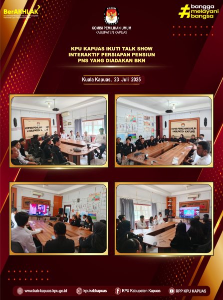 Sekretaris KPU Kabupaten Kapuas Heldayani bersama Kasubbag Parmas dan SDM Gagah Christiantoro, Kasubbag KUL Tanti Lupitae, dan Plt. Kasubbag Teknis dan Hukum Siti Nur Rahmayanti, Serta Staf Sekretariat mengikuti Talk Show Interaktif yang diadakan oleh BKN dengan tema "ASN Cerdas Finansial : Merancang Masa Depan Pensiun yang Sejahtera" secara daring melalui zoom meeting di ruang RPP KPU Kabupaten Kapuas.