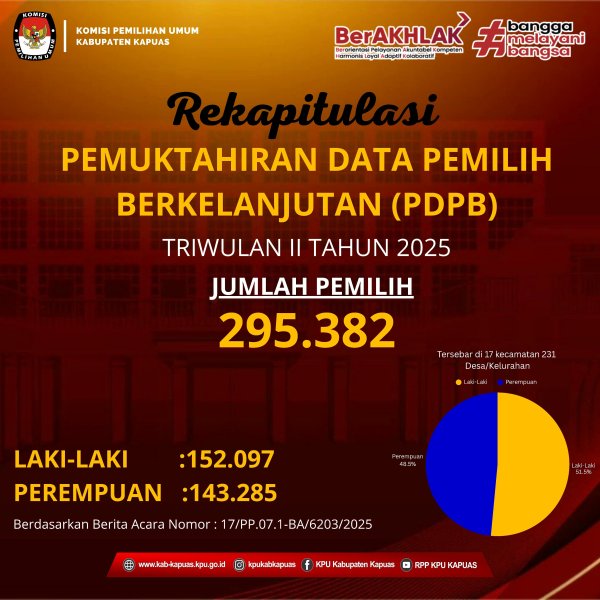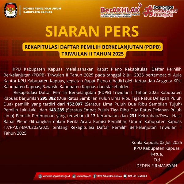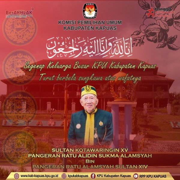 Segenap keluarga besar KPU Kabupaten Kapuas mengucapkan turut berbelasungkawa atas Wafatnya Yang Mulia Sultan Kotawaringin XV, P.R. Alidin Sukma Alamsyah bin P.R. Alamsyah, pada Jumat dini hari, 4 Juli 2025 (81 tahun), di RS PKU Muhammadiyah Surakarta.