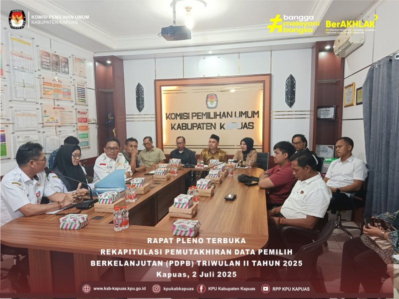 Rapat dipimpin oleh Ketua KPU Kabupaten Kapuas Deden Firmansyah, bersama Anggota KPU Kabupaten Kapuas Divisi Rendatin M. Fery Irawan, Divisi Hukum dan Pengawasan Charles Bronson, Divisi Sosdiklih, Parmas dan SDM Maya Widya Sari Sihombing, Kasubbag Rendatin Dukan Choiri, Kasubbag Parmas dan SDM Gagah Christiantoro, Plt. Kasubbag Teknis dan Hukum Siti Nur Rahmayanti,.serta turut dihadiri oleh yang mewakili dari Bawaslu Kabupaten Kapuas, Perwakilan Kesbangpol Kabupaten Kapuas, Kasat Reskrim Polres Kapuas, Perwakilan Kodim 1011/KLK Kapuas, dan Kepala Dinas Dukcapil Kabupaten Kapuas, Binda Kabupaten Kapuas, serta Penyerahan Berita Acara Hasil Rekapitulasi Daftar Pemilih Berkelanjutan (PDPB) Triwulan II Tahun 2025. Adapun Rekapitulasi Pemutakhiran Data Pemilih Berkelanjutan(PDPB) Triwulan II Tahun 2025 berjumlah 295.382 dengan jumlah Laki-laki sebanyak152.097 dan Perempuan sebanyak 143.285, kemudian Rekapitulasi Perubahan Pemilih Hasil Pemuktahiran Data Pemilih Berkelanjutan Triwulan II Tahun 2025 Jumlah Pemilih Baru sebanyak 4.263, Jumlah Pemilih Tidak Memenuhi Syarat sebanyak 3.898. Adapun Berita Acara Rapat Pleno sebagaimana terlampir yang dapat diunduh disini