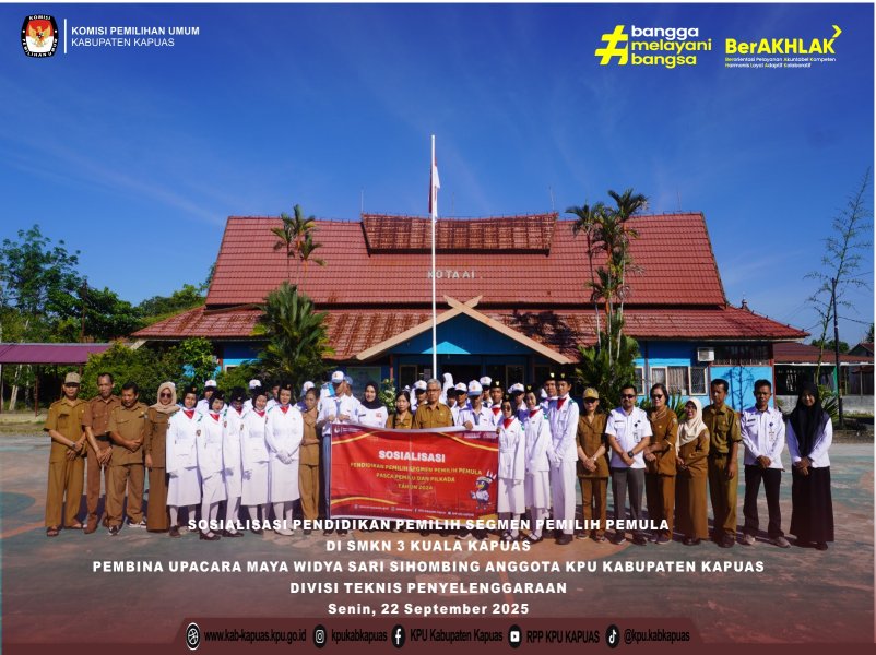 Kuala Kapuas - https://kab-kapuas.kpu.go.id/- Komisi Pemilihan Umum (KPU) Kabupaten Kapuas kembali melaksanakan kegiatan Sosialisasi Pendidikan Pemilih Segmen Pemilih Pemula di SMK Negeri 3 Kuala Kapuas saat pelaksanaan Upacara Bendera di halaman sekolah, Senin (22/09/2025).